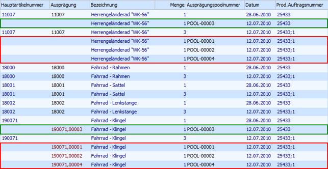 Nachdem die Auswahl der Poolnummern getroffen wurde, wird der Programmbereich "Ausprägung" geöffnet. In diesem werden die Poolnummern bzw. die bereits zugeordneten Komponenten mit Identnummer, gemäß der getroffenen Auswahl, den beiden Produktionsaufträgen zugeordnet.