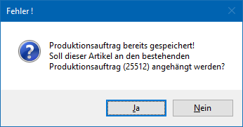 Über die Eingabe einer bereits existierenden Produktionsauftragsnummer ist es möglich den aktuellen Auftrag an einen bestehenden Produktionsauftrag anzuhängen. Hierzu muss nach dem Drücken des Buttons "Ok" bzw. der Taste F5 der folgende Hinweis mit "Ja" bestätigt werden.