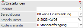 An dieser Stelle kann für den Produktionsauftrag eine Stapelnummer hinterlegt werden. Die Stapelnummer kann wiederum in verschiedenen Programmbereichen (z.B. Leitstand, Materialentnahme, Arbeitsschein, etc.) als Selektionskriterium verwendet werden.