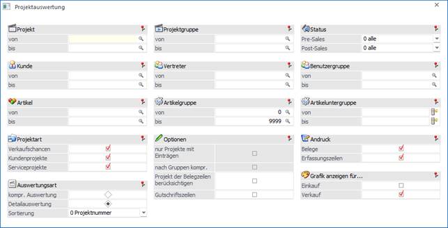 Die zur Auswertung heranzuziehenden Projektarten (Verkaufschancen, Kundenprojekte, Serviceprojekte) können durch Aktivieren der Checkboxen bestimmt werden.