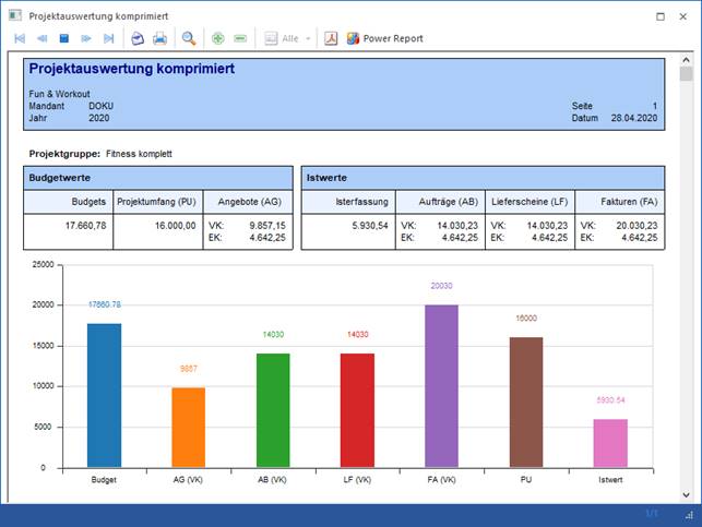 Komprimiert: Es wird für jedes Projekt die Summe der Budget- und Istwerte in Zahlen und mit einer Grafik dargestellt.