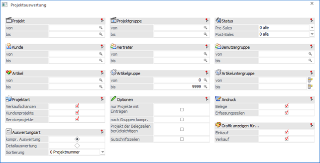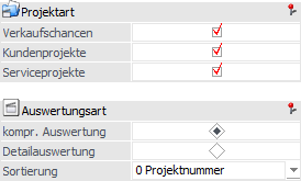 Mit Hilfe von Checkboxen kann definiert werden, was für Projektarten bei der Auswertung berücksichtigt werden sollen. Es stehen die folgenden Varianten zur Verfügung: