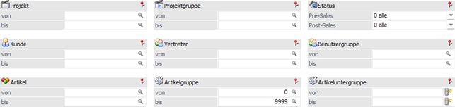 Hier kann eine Einschränkung der Projekte auf Projektgruppenbasis vorgenommen werden. Über die Matchcodefunktion kann nach allen Projektgruppen gesucht werden.