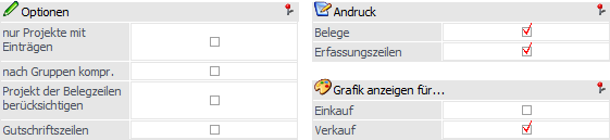 Hier kann gesteuert werden, ob die Belege und / oder die Erfassungszeilen ebenfalls ausgewertet werden sollen. Diese Einstellung bestimmt auch den Umfang der Auswertung. Wenn beide Optionen aktiviert sind, werden für jedes Projekt die zugehörigen Belege und Projekterfassungszeilen angedruckt. Wenn nur die Option "Belege" aktiviert ist, so werden für jedes Projekt nur die zugehörigen Belege angedruckt. Wenn nur die Option "Erfassungszeilen" aktiviert ist, so werden für jedes Projekt nur die Projekterfassungszeilen angedruckt.