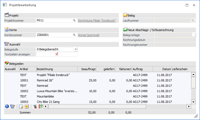 … aufgerufen wird, besteht die Möglichkeit auf Grundlage eines Projekts Anzahlungsrechnungen (auch Abschlagrechnungen oder Teilrechnungen genannt) und Schlussrechnungen zu schreiben und die dazugehörigen Buchungen für die WinLine FIBU zu erstellen.