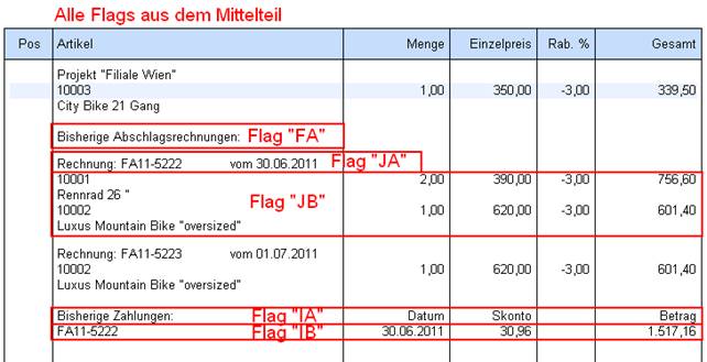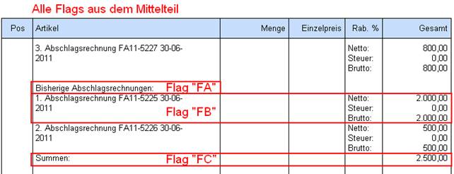 Über die Kombination mit dem Flag "C" kann im Rechnungsfuss der Gesamtnetto-, -steuer- und -bruttobetrag aller Teilrechnungen angedruckt werden (Var. 0/838 bis 0/840). Dieses gilt nur Beträge, welche über den Typ "6 - Abschlagsrechnung (Wert)" fakturiert wurden.