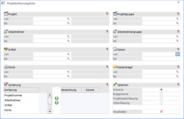 … können die Projekterfassungszeilen aufgrund unterschiedlicher Kriterien ausgegeben werden, wobei die Daten auch nach diversen Kriterien sortiert und summiert werden können.