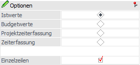 Über diese Auswahl kann gesteuert werden, ob bei der Auswertung die Istwerte, die Budgetwerte, die Projektzeiterfassungen oder die Zeiterfassungswerte berücksichtigt werden sollen.