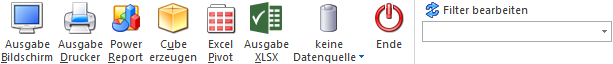 Der Button "Datenquelle verwenden" wird nur angeboten, wenn für diesen Bereich (bezogen auf den aktuellen Benutzer / Mandanten) zumindest eine private oder öffentliche Datenquelle existiert. Des Weiteren stehen die Ausgabevarianten "Ausgabe Bildschirm" und "Ausgabe Drucker" nicht zur Verfügung.