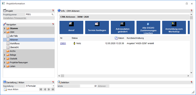 An dieser Stelle werden die CRM-Aktionen, gemäß der nachfolgenden Selektion, dargestellt. Die Art der Anzeige kann mit Hilfe der Option "Darstellung" gewählt werden.