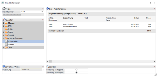 An dieser Stelle werden die Projekterfassung des Projekt (Typ "Budget"), gemäß der nachfolgenden Sortierung, dargestellt.