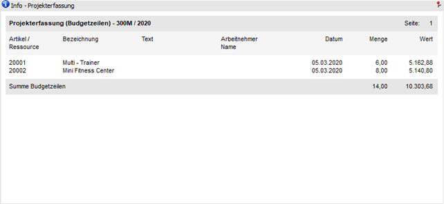 In dieser Ansicht werden die erfassten Budgetzeilen des Projekts angezeigt.