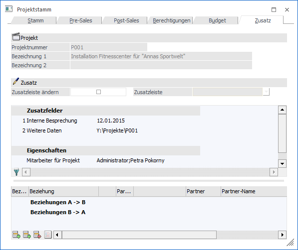 In dem Register "Zusatz" werden die Zusatzfelder, die Eigenschaften und die Beziehungen des Projekts erfasst.