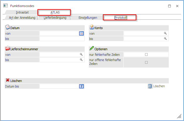 Im Register "Protokoll" können zum einen Protokolle über die Lieferscheine mit verschiedenen Einschränkungen ausgegeben werden und zum anderen Protokolle gelöscht werden.