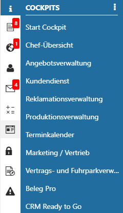 Über das Menü des Bereichs "Cockpit" werden folgende Funktionen zur Verfügung gestellt: