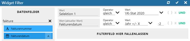 Sollen innerhalb der Datenquelle weitere Einschränkungen geltend gemacht werden, so besteht über die Filterdefinition diese Option, sodass aus dem Bereich "Datenfelder" via Drag and Drop "Dimensionen" bzw. "Werte" in den Bereich "Filterfeld hier fallen lassen" gezogen und fallengelassen werden können.