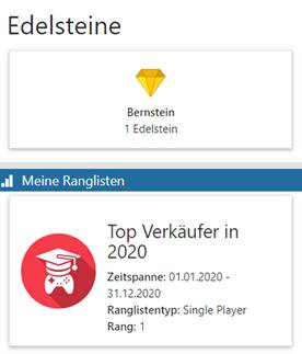 Es können so für Edelsteine bezugnehmende SMART SCORE Elemente angezeigt werden, sodass der Benutzer stets den Ursprung seiner Verdienste erkennen kann. Das darin enthaltene Ranglisten-Element öffnet (analog zur Ranglisten-Kachel "Meine Ranglisten" der SCORE Übersicht) Details zur Rangliste.