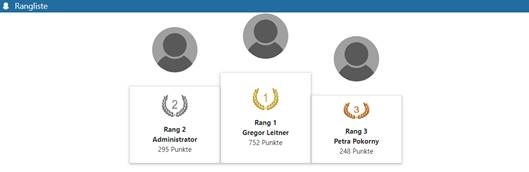 Hier werden zusammenfassend Informationen zur Ranglistendefinition, Platzierung und enthaltener Regeln aufgeführt. Jede der abgebildeten Kacheln ist interaktiv und gibt Profilinformationen des entsprechenden Benutzers aus.