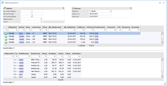 In diesem Menüpunkt werden alle Beleg bzw. alle erfassten Barbelege angezeigt und können anschließend mittels Ribbon-Buttons oder der rechten Maustaste angezeigt, gedruckt oder storniert werden.