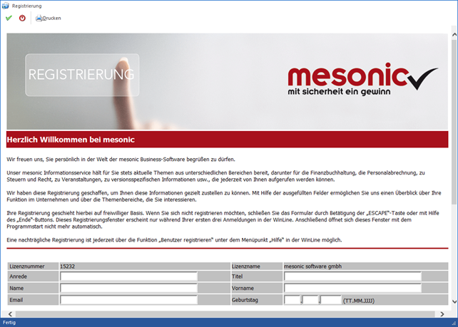 Um WinLine an die Anforderungen Ihres persönlichen Arbeitsplatzes anzupassen und Sie optimale, mit Informationen zu versorgen, ist eine einmalige Registrierung erforderlich.