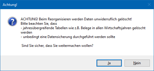 D.h. bevor der Reorg durchgeführt wird, sollte unbedingt eine Datensicherung erstellt werden! Im Anschluss an die Meldung wird die Reorg-Selektion angezeigt.