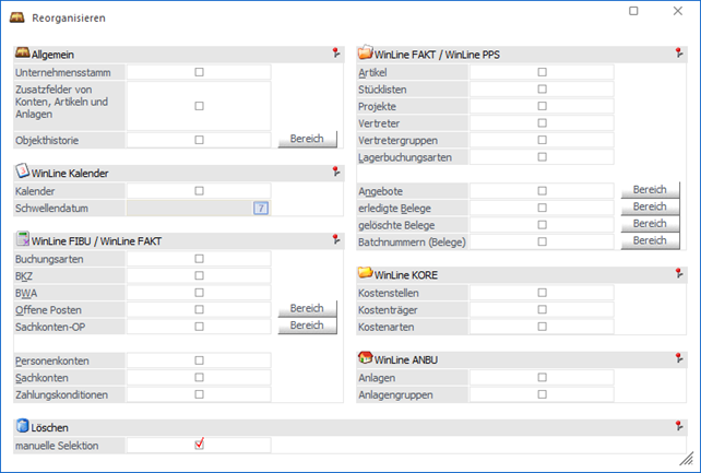 Wurde die Option "manuelle Selektion" aktiviert und Daten aus den Bereichen "Stammdaten" und "Bewegungsdaten" gewählt, so werden zunächst die Bewegungsdaten reorganisiert und anschließend der der Selektions-Bereich geöffnet.