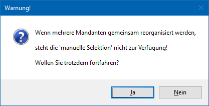 Wird diese mit "Ja" bestätigt, so wird das Fenster "Mandanten-/Jahres-Selektion" geöffnet und die Mandanten können gewählt werden. Bei "Nein" kann keine Mandantenselektion erfolgen.
