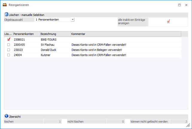 Ist diese Option aktiv, so werden alle Datensätze angezeigt - auch jene, die im Zuge des Reorgs nicht gelöscht werden können (z.B., weil ein Konto bebucht wurde).
