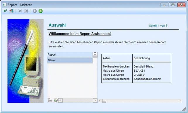 Mittels Abbruch-Button wird der Assistent abgebrochen und in den ersten Schritt des Assistenten (Willkommen beim Report-Assistenten) gewechselt.