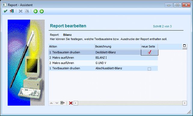 Im zweiten Schritt können die gewünschten Textbausteine und Makros ausgewählt, bzw. beim einem bestehenden Report diese Einträge bearbeitet werden.