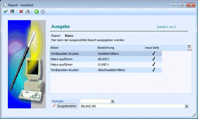 können mit dessen Hilfe die verschiedensten Auswertungen zusammengestellt werden. Ein Report besteht aus einem oder mehreren Makros, die bestimmte Aktionen in der WinLine ausführen (z.B. automatische Ausgabe der Bilanz) und Textbausteinen, welche die Kommentierung darstellen. Diese Reports werden in einer SPL-Datei ausgegeben und können ausgegeben bzw. gespeichert werden.