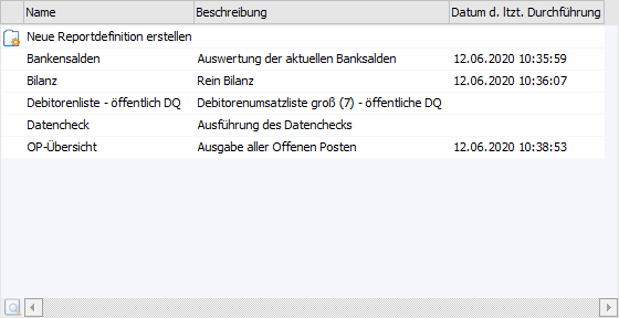 In der Tabelle alle bereits vorhandenen Reportdefinitionen angezeigt werden. Ein neuer Report kann durch die Anwahl der Eintrag "Neue Reportdefinition erstellen" erzeugt werden.
