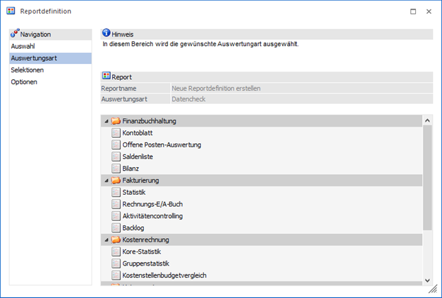 In diesem Bereich kann die Art der Auswertung (d.h. des Reports) angegeben werden.