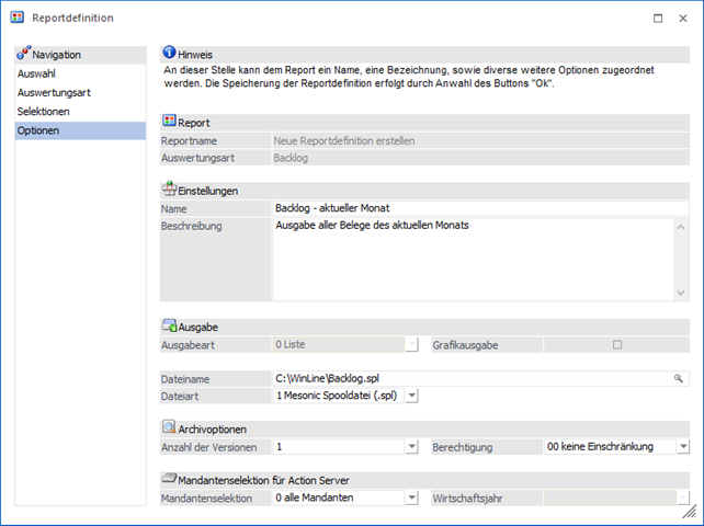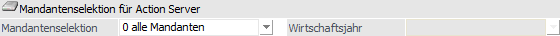 Mit den Optionen "Mandantenselektion" und "Wirtschaftsjahr" kann bestimmt werden, für welche Mandanten bzw. Wirtschaftsjahre der Report gültig ist, d.h. in Menüpunkt "Action Server - Definition" eingetragen werden kann.