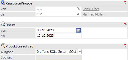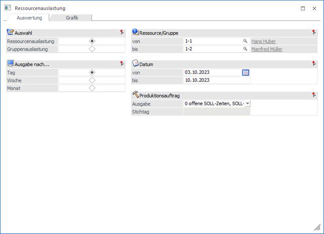 Die Ausgabe der Ressoucenauslastung kann nach den folgenden Kriterien eingeschränkt bzw. definiert werden: