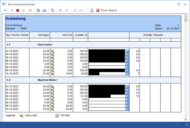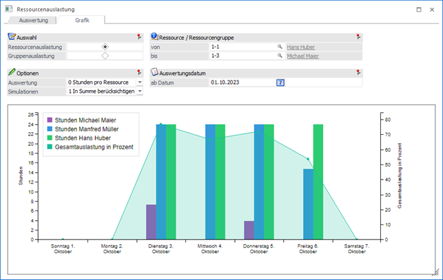 Register "Auswertung" kann die Ressourcenauslastung in Form eines Drucks