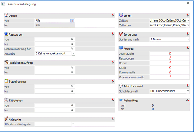 Bei der Einschränkung in diesem Feld auf eine Mitarbeiter-Ressource werden evt. auch die Belegungen für Werkzeug-Ressourcen mitangedruckt, die für die jeweilige Tätigkeit benötigt sind.