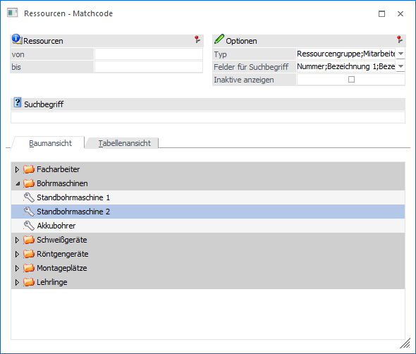 Wenn der Fokus in dem Feld "Ressource" oder "Ressourcengruppe" liegt und das Lupen-Symbol bzw. die Taste F9 gedrückt wird, dann öffnet sich das Programm "Ressourcen - Matchcode". An dieser Stelle kann gezielt nach Ressourcen der WinLine PPS gesucht werden.