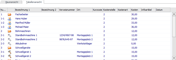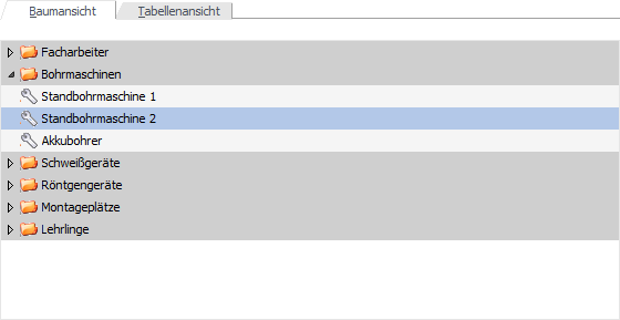 Nach Auslösen der Suche (Button "Anzeigen" oder Suchbegriff bestätigen) werden die gefundenen Ressourcen in Form einer Baumansicht oder einer Tabellenansicht angezeigt (abhängig vom gewählten Register).