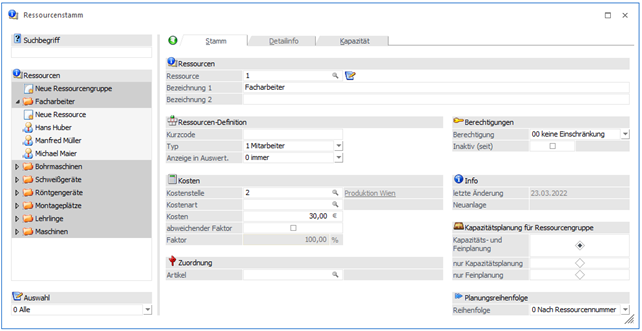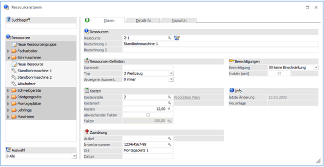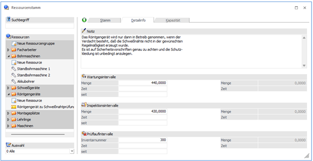 Durch einen Wechsel in den Bildschirmabschnitt "Detailinfo" stehen je nach Ressourcentyp weitere Felder zur Bearbeitung zur Verfügung.