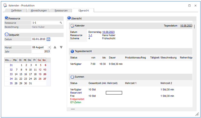 Im Kalender wird die Auslastung der Ressource durch Projekte am aktuellen Tag angezeigt, bzw. welches Potential die einzelnen Ressourcen noch haben. Darüber hinaus können hier die Ressourcenrelevanten Kalendereinträge (Anwesenheit, etc.) bearbeitet werden. Details zum Kalender entnehmen Sie dem Kapitel Kalender - Produktion.