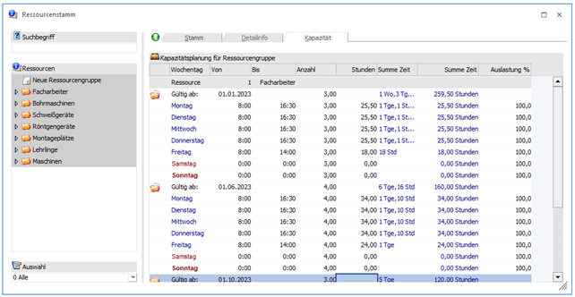 Im Register "Kapazität" können dann - gültig ab einem einzugebenden Stichtag - wöchentlich die geplanten Ressourcen ohne Zuordnung einer bestimmten Ressource eingegeben werden. D.h. es wird nur die Zeitspanne (von - bis) und die Anzahl der vorhandenen Ressourcen eingetragen.