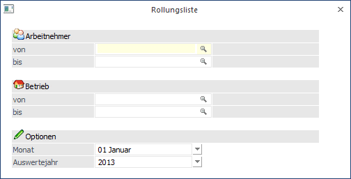 In diesen Feldern kann auf die Betriebe eingeschränkt werden, für die die Rollungsliste durchgeführt werden sollen.
