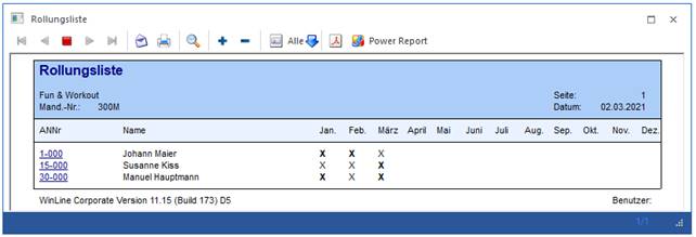 Aus der Auswahllistbox kann gewählt werden, ob die Ausgabe am Bildschirm oder am Drucker durchgeführt werden soll. Standardmäßig wird die Ausgabe auf Bildschirm vorgeschlagen, die auch durch Drücken der F5-Taste gestartet werden kann. Als Ergebnis erhält man eine Liste aller AN, die in der ausgewählten Periode gerollt wurden. Dabei wird für jeden Monat, in dem eine Rollung durchgeführt wurde, ein X angezeigt.