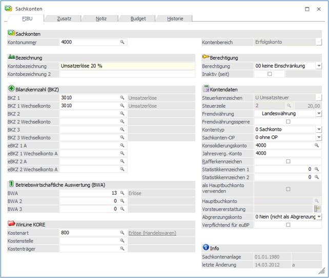 Es wird das Sachkonto mit allen entsprechenden Daten angezeigt.