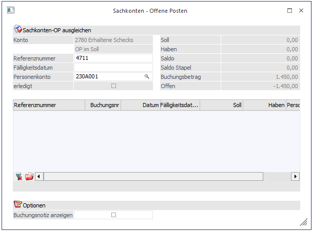 Anhand der Referenznummer wird nun bei jeder Buchung auf ein solches OP-Sachkonto geprüft, ob sich die Buchungen mit derselben Referenznummer saldieren oder nicht.