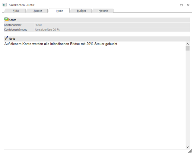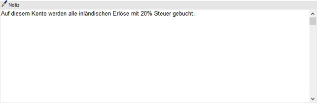 In dem Register "Notiz" des Sachkontenstamms kann eine Zusatzinformation in Form eines Notizblockes hinterlegt werden (formatierbarer Fließtext).