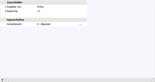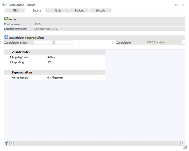 Im Register "Zusatz" des Sachkontenstamms können Zusatzfelder und Eigenschaften des Sachkontos hinterlegt werden.