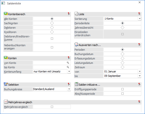 Die Saldenliste ist die Aufstellung der Konten mit den Kontenumsatzdaten der laufenden Periode, der kumulierten Werte und des Saldos. Der Aufruf erfolgt über den Menüpunkt…