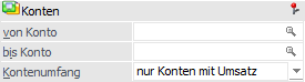 Hier kann eine Einschränkung der Ausgabe durch Angabe von Kontengrenzen erfolgen. Werden die Felder leer gelassen, so bewirkt dieses die Ausgabe aller Konten.